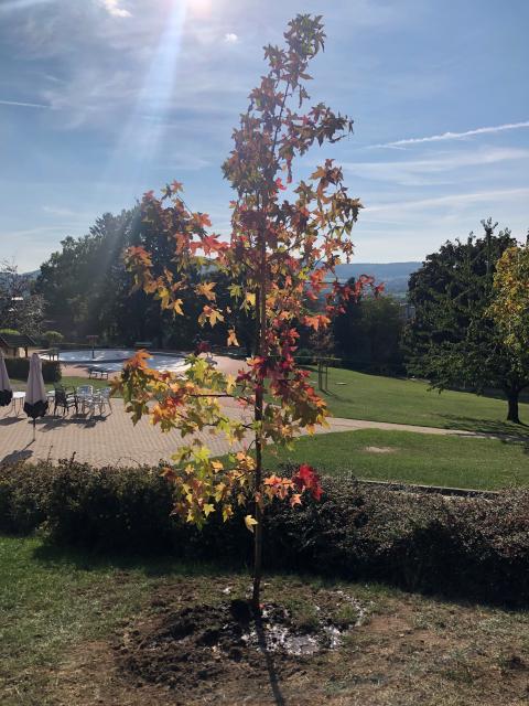 Eine schöne Aktion, die insbesondere Lina, Marco, Christian und Ute Einiges an Kraft und starken Nerven abverlangt und die Kreativität von Mariana und Monja herausgefordert hat. Herausgekommen sind viel Spaß, Gemeinschaftsgeist und ein Amberbaum, der nun im Bergbad seine volle Pracht zeigen darf.